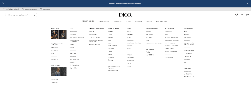 I was very surprised with Dior. I did notice some Chanel-like vibes going on in the website design. But unlike Chanel and other luxury brands, Dior didn’t reply on a blank-and-white motif for their website design. The Dior brand doesn’t now automatically associate with a specific color (like the Tiffany’s blue or the Burberry beige & red neutrals palette). So instead, Dior picked a beautiful indigo blue as their color anchor; tying in clothing designs, bag color options, and website together with various shades.