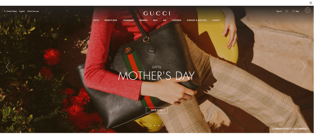The website gave off weird hipster vibes and unlike many of their competitors, Gucci didn’t seem to follow the color theme associated to their brand on their website. Website itself was easy to navigate (no de-activating of the sort by price function!). And what was impressive was that they had a children’s collection that had options for newborns! Now does your 6 month old need a Gucci branded onesie… thats a whole other question.