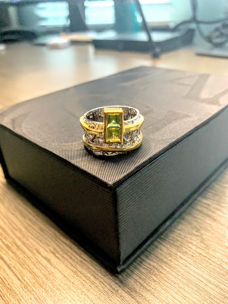 That being said, this was different. The accent of the yellow gold on the silver (925 AG engraving on the inside!) with the light olive colored peridot stone fit perfectly against my natural complexion… and they match my eyes!