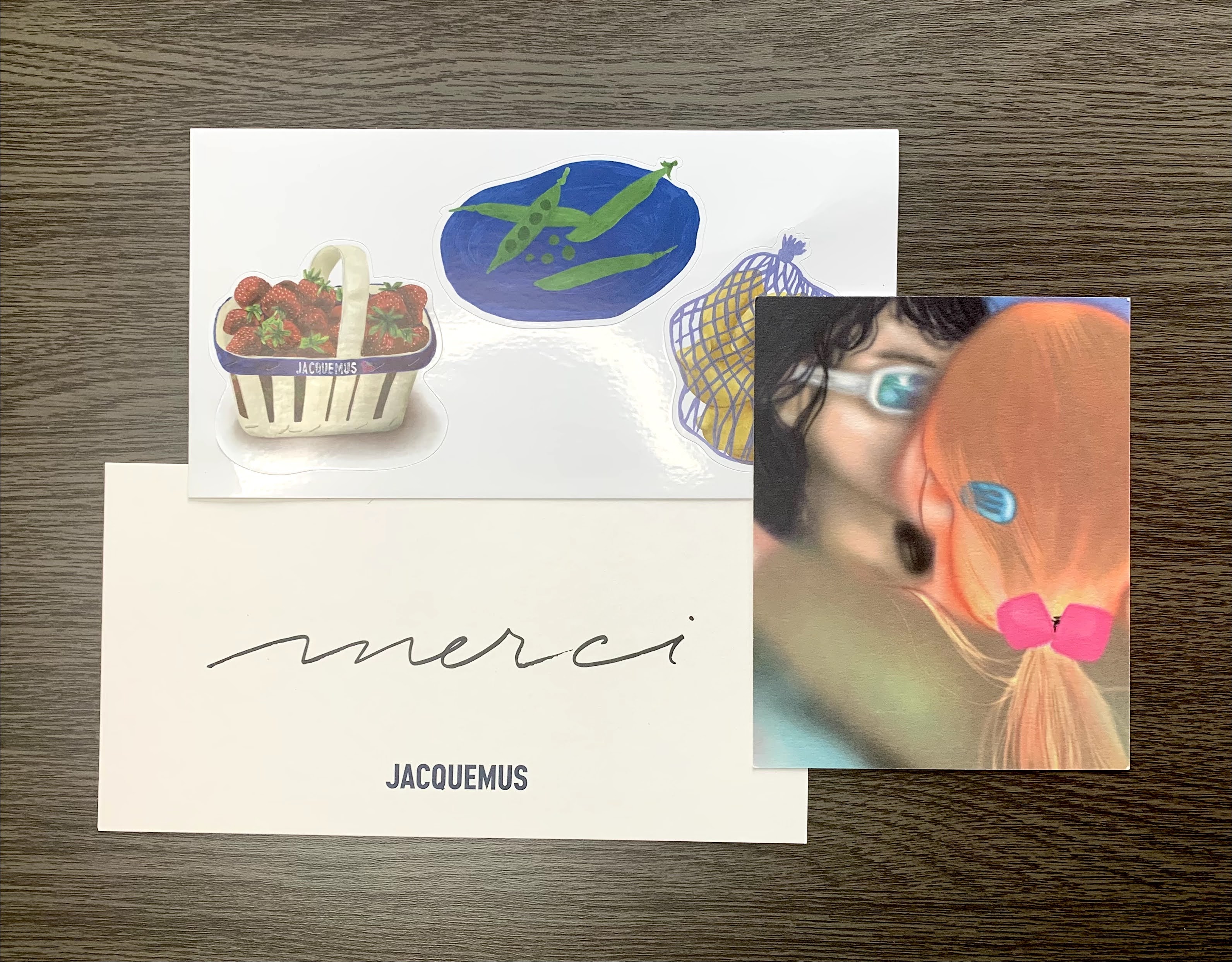 On another note – complimentary shipping and gifts! With my order, Jacquemus sent me two postcards and one of which comes with food-themed stickers! Although the Versace stamp-themed stickers are still my favorites, I still appreciate the gesture!
