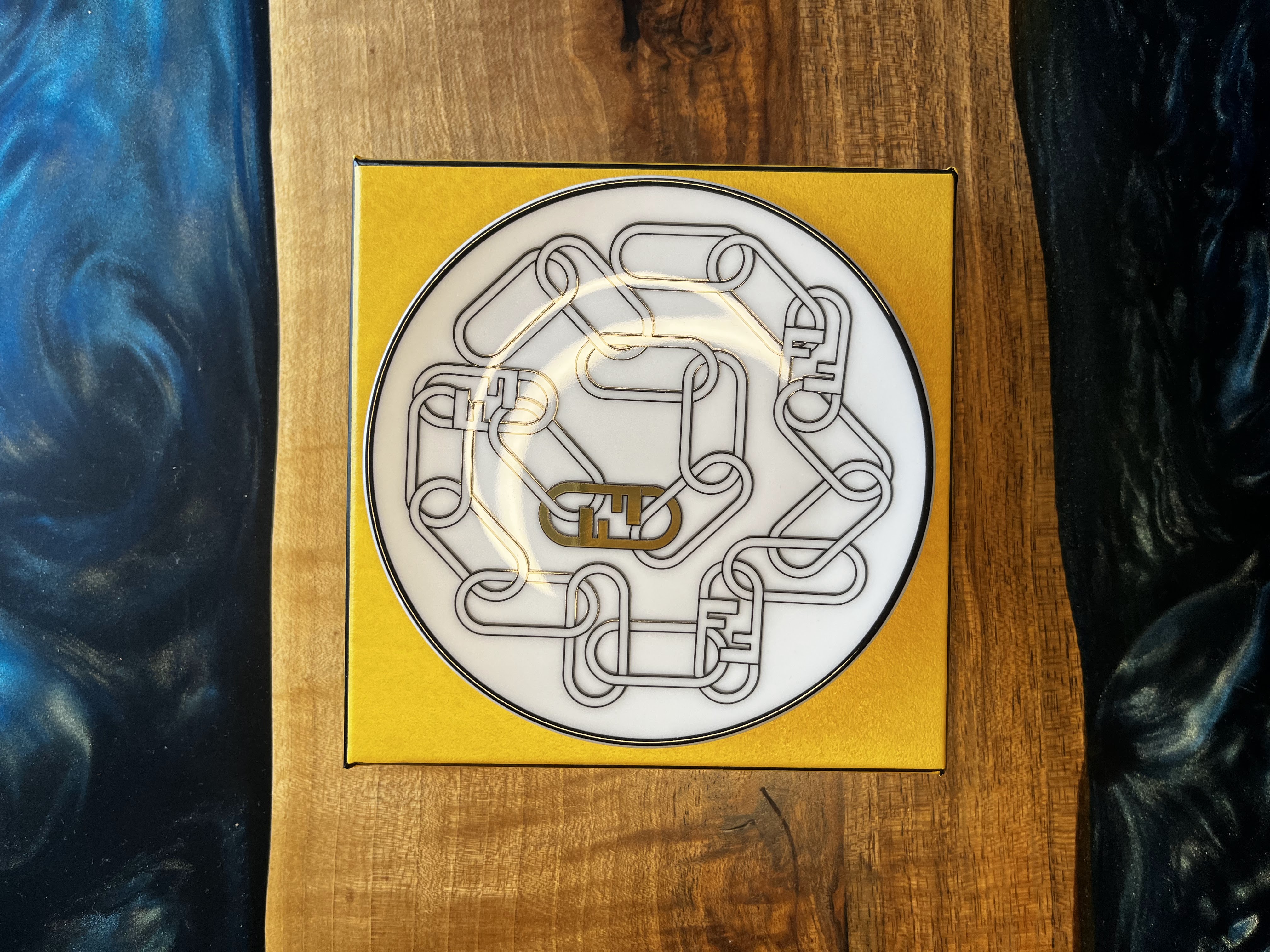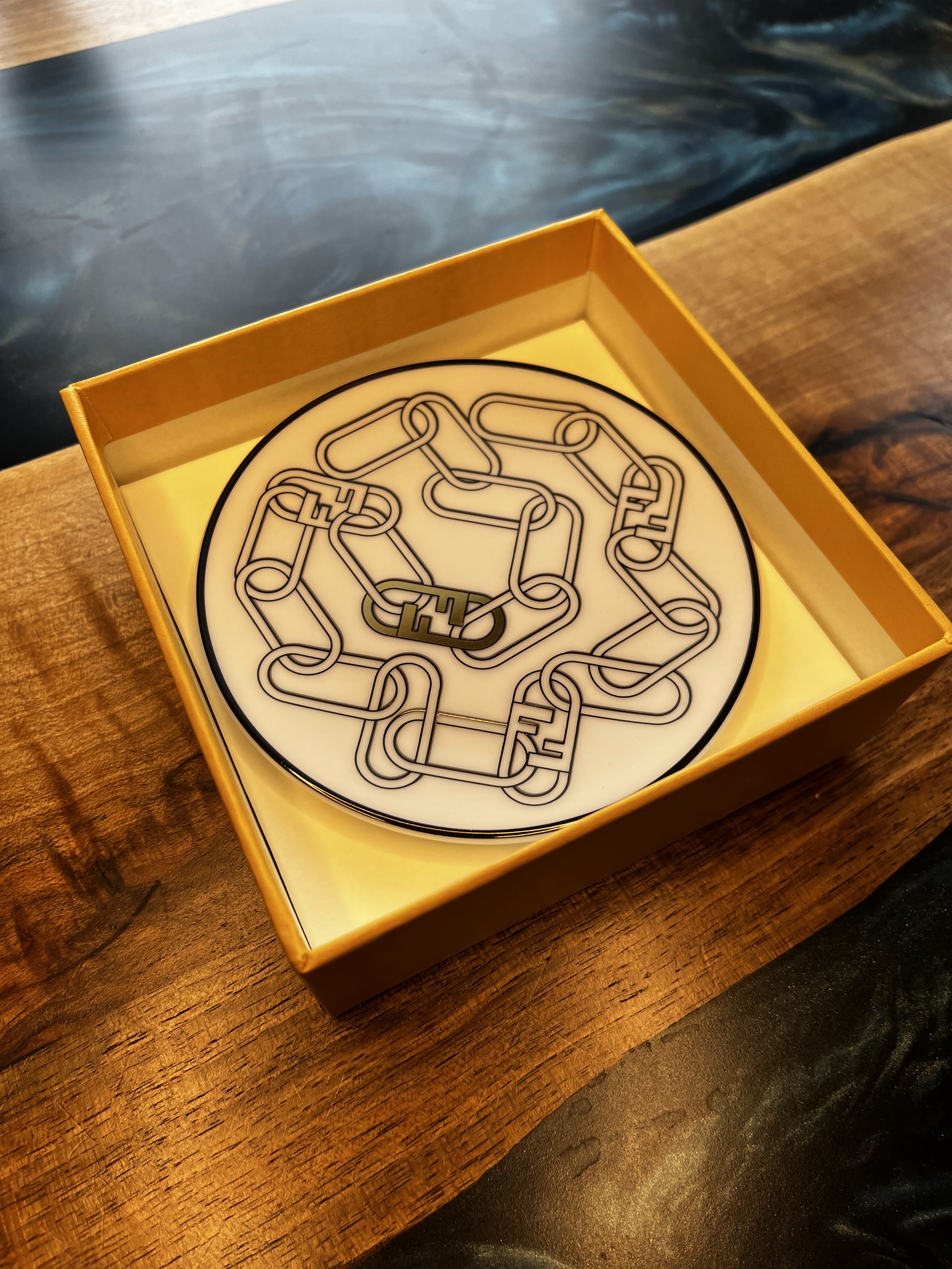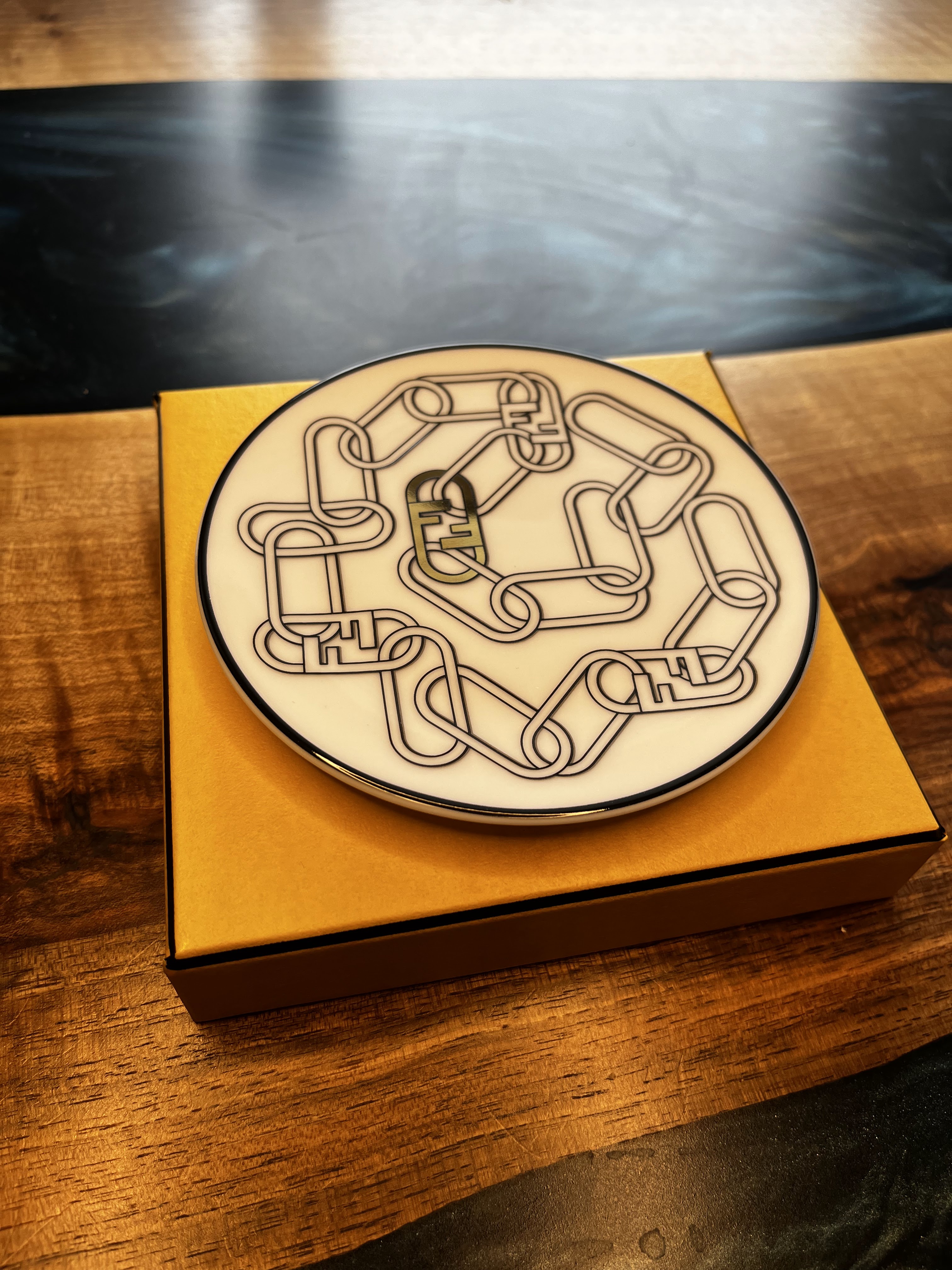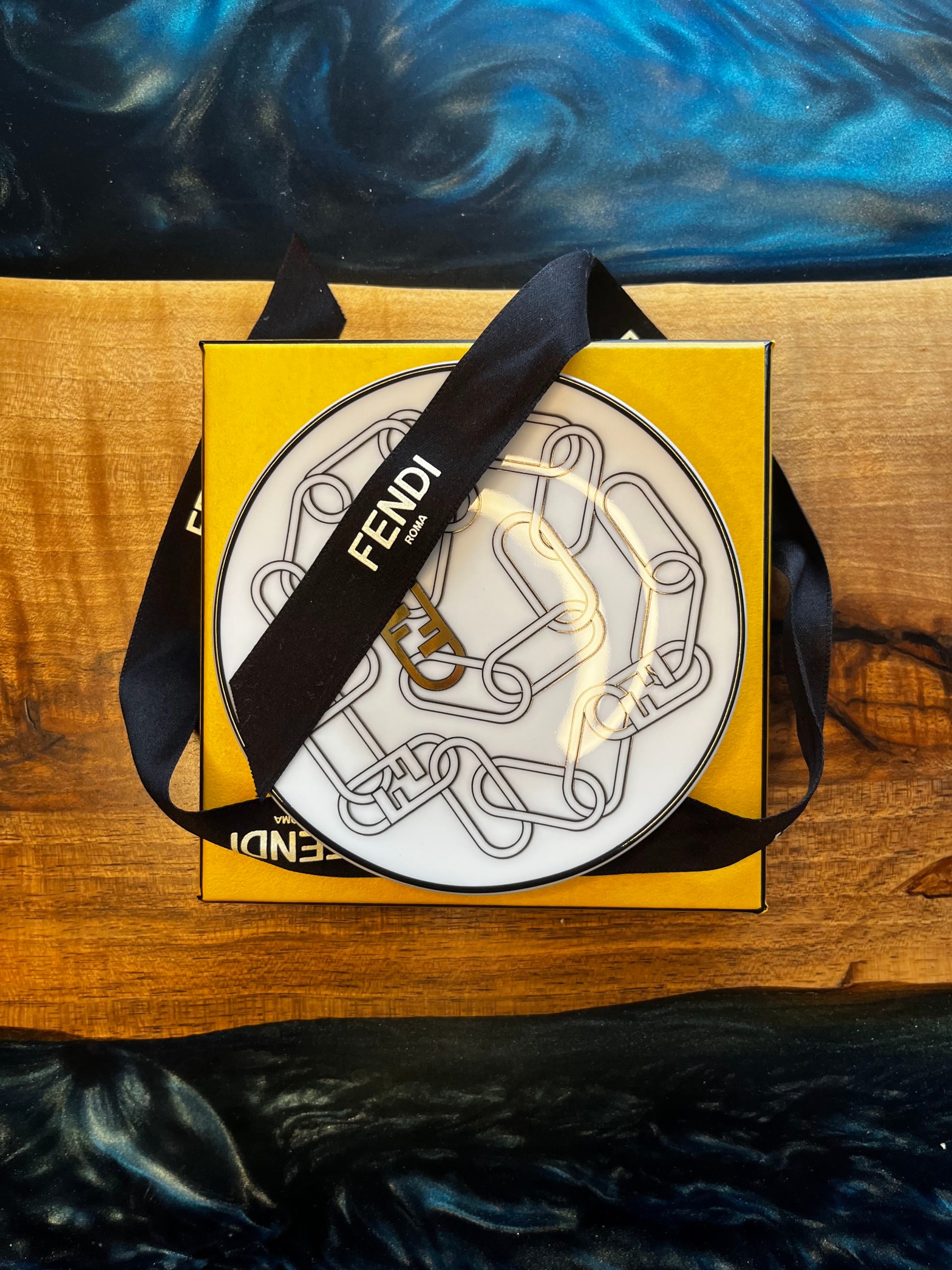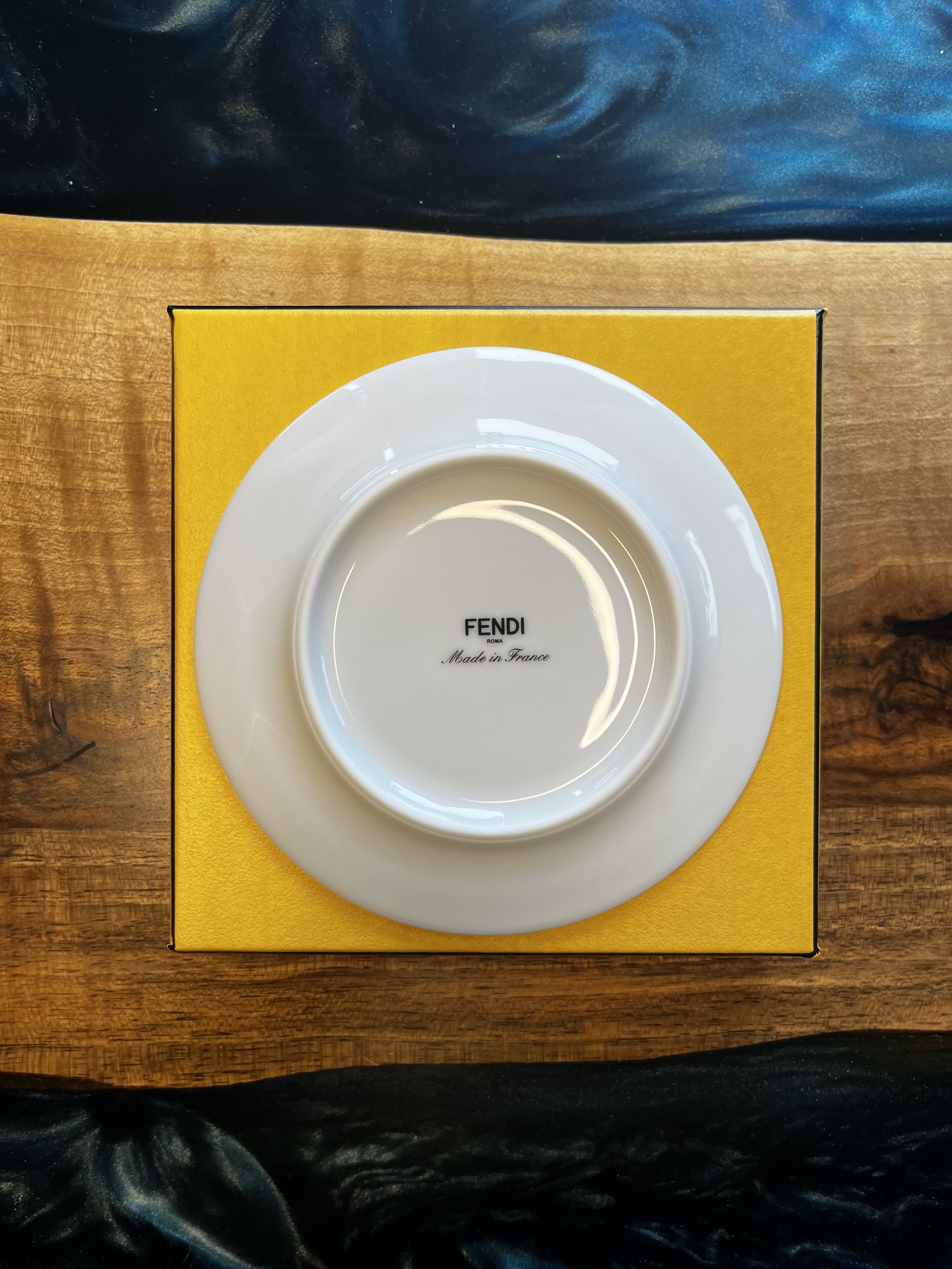 The O’Lock Bread Plate from Fendi measures in at 11cm (4.3 inches in diameter) and is made from 100% Limoges porcelain. Limoges is a city in France known for its high quality ceramics and exceptional craftsmanship of porcelain. Vintage Limoges porcelain can be extremely value in the secondary market.